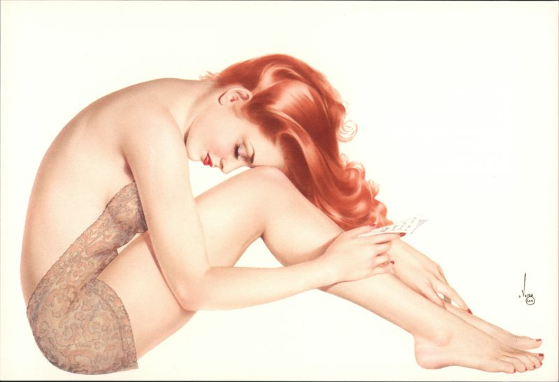 The image features a woman with flowing red hair, sitting with her knees drawn up, looking down at a small piece of paper. She is depicted in a classic pin-up style, partially draped in a sheer, lace-patterned garment.