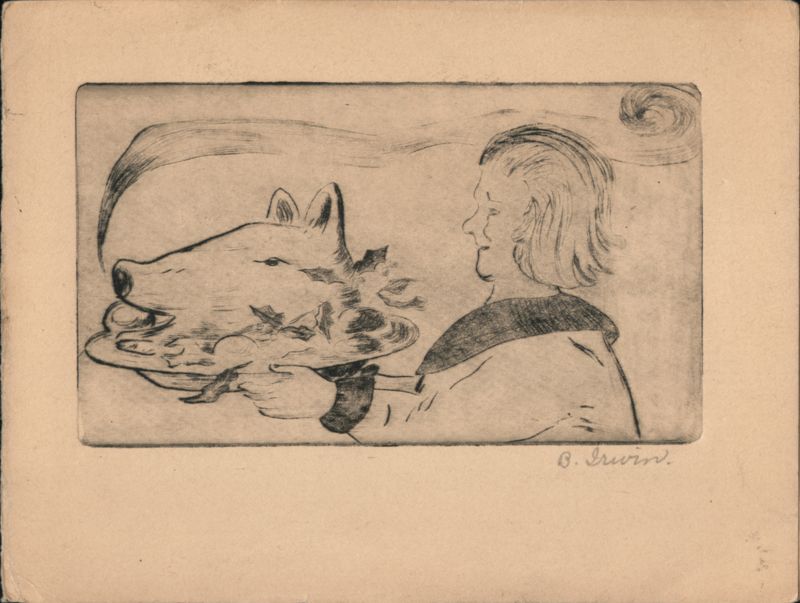 An etching depicts a person, possibly a youth, in profile, holding a large platter. On the platter rests a pig's head, adorned with leaves. A swirling line extends from behind the pig's head.