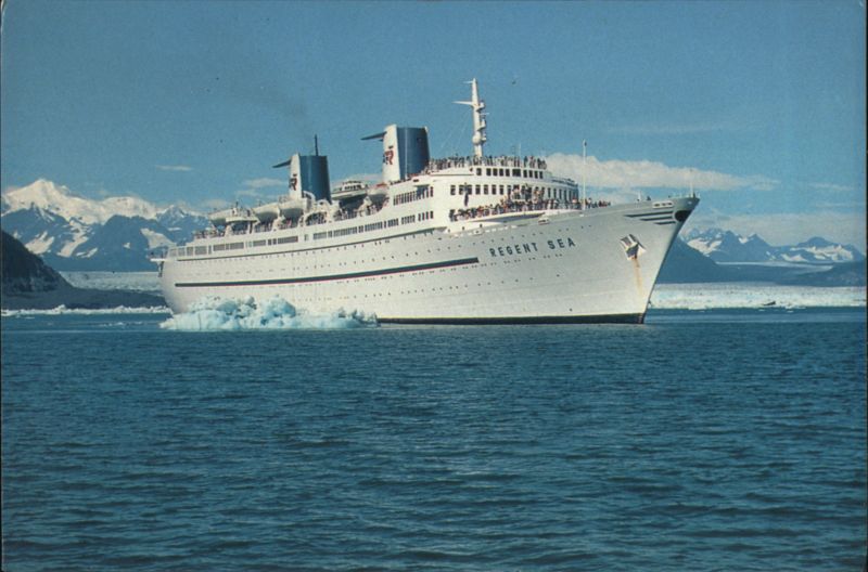 The Regent Sea cruise ship sails through Alaskan waters with ice floes and snow-capped mountains in the background. The reverse side is an advertisement for Regency Cruises' 1994 Alaska sailings, offering a '2nd PERSON FREE' promotion.