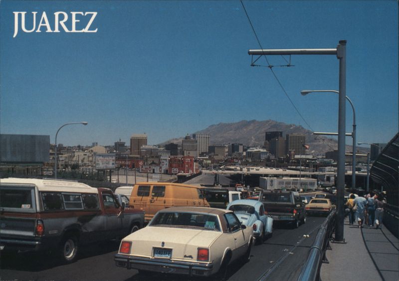 Cars crossing the International Bridge from Juarez, Mexico into El Paso, Texas, with city buildings and mountains in the background under a clear sky.
