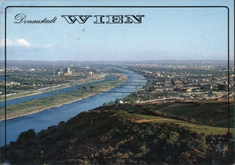 Panoramic aerial view of Vienna with the Danube River and multiple bridges, surrounded by green hills and urban development.