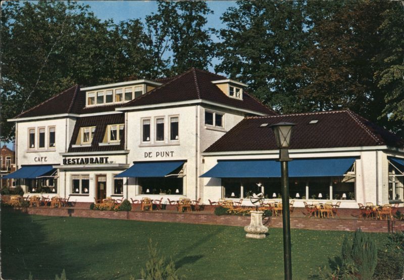 | A white building with a brown roof and blue awnings, featuring outdoor seating on a large lawn. Located on the old road between Amersfoort and Apeldoorn, offering excellent dinners, a beautiful terrace, and spacious parking. Easily accessible via E8 highway, exit Voorthuizen. |