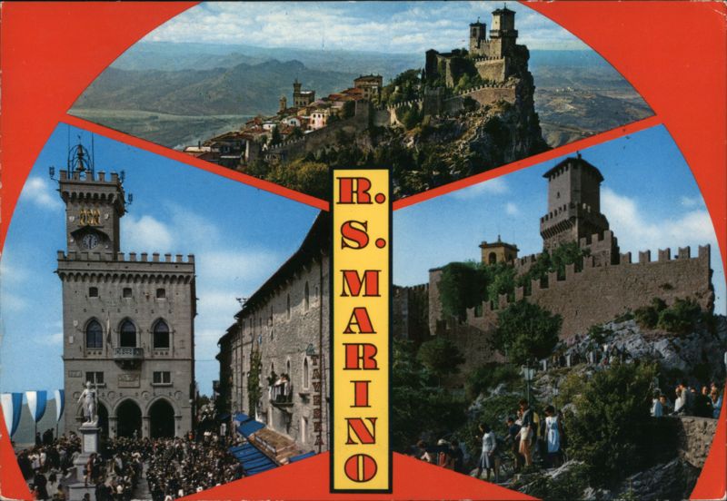 The postcard features a collage of three distinct views: a panoramic mountain landscape, the historic Public Palace with a prominent clock tower and a statue, and the iconic Three Towers on a rocky outcrop with people walking below.