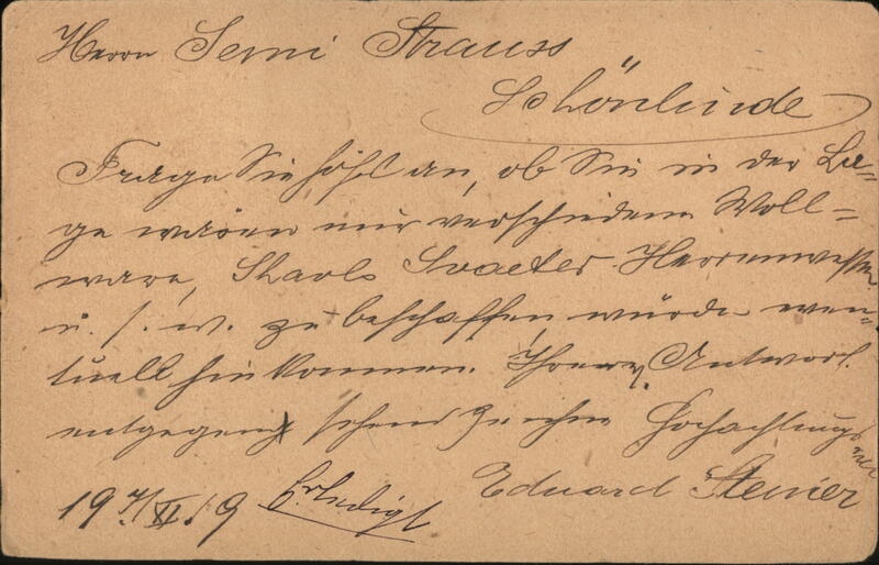 A personal message in German, dated January 19, 1919, sent from Žižkov (Prague) to Semi Strauss in Schönlinde.