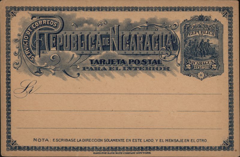 An official government-issued postal card for interior use within Nicaragua, featuring the country's name prominently and an integrated 2-centavo stamp design with a group of figures.