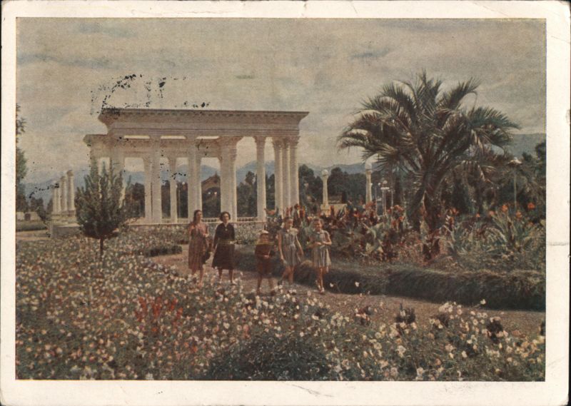 A scenic view of Primorsky Boulevard in Batumi, featuring a classical colonnade structure, vibrant flower beds, and palm trees. Several people are walking along the path.