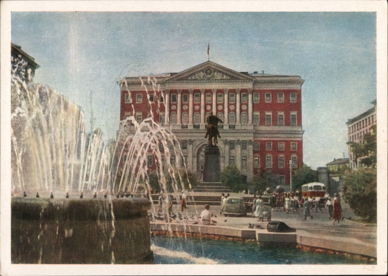 View of the Moscow Soviet of Working People's Deputies building with a large fountain in the foreground. People are visible walking near the fountain and building.