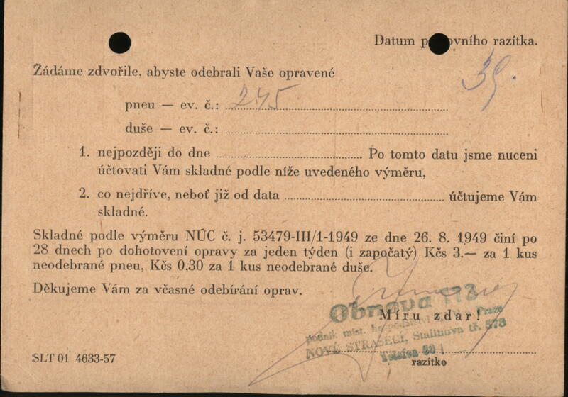 | A business form from 'Obnova', a repair shop in Nové Strašecí, Czechoslovakia, detailing storage fees for uncollected repaired tires and tubes. The form, dated August 26, 1949, also lists other services offered by the shop, including footwear, hosiery, and leather goods repair. |