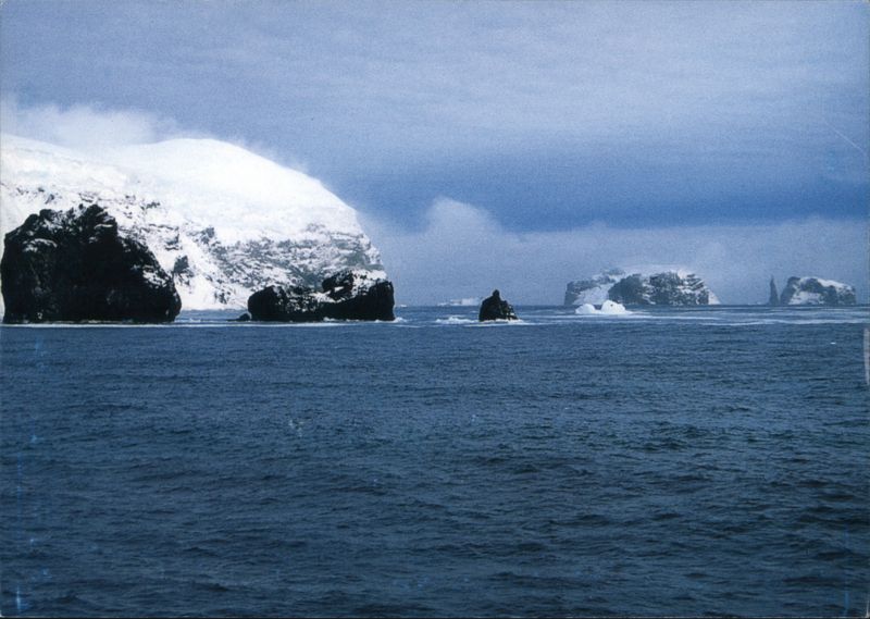 Large, snow-covered islands and rocky outcrops rise from a dark blue ocean under a cloudy sky.