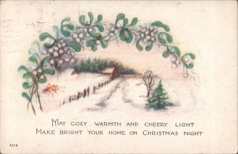 A charming illustration of a snow-covered landscape featuring a cozy house, a winding path, and evergreen trees, all encircled by a festive mistletoe wreath. The scene evokes a sense of warmth and cheer during the holiday season.