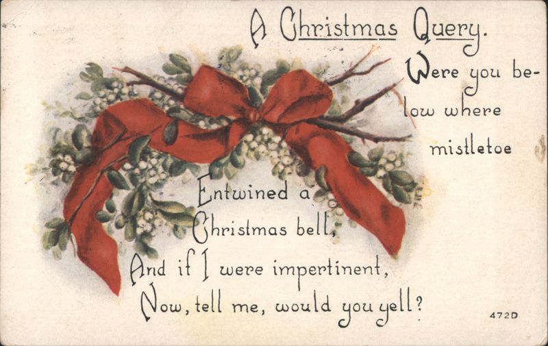 A festive illustration featuring a large red bow tied around a wreath of mistletoe and holly, with a Christmas bell. The card includes a playful Christmas query poem.