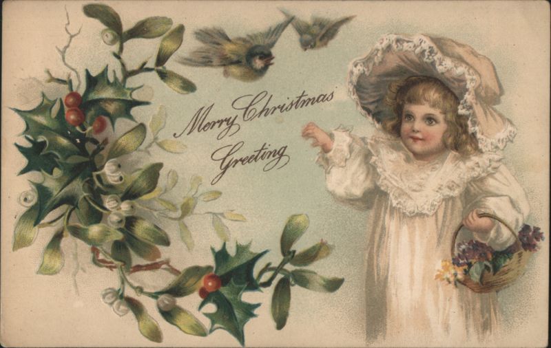A young girl in a white dress and bonnet holds a basket. Branches of holly with red berries and mistletoe with white berries frame the left side of the image. Two birds fly in the upper right. The card conveys a holiday message.