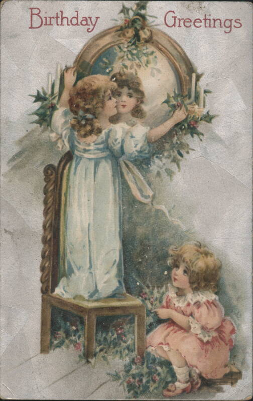 An illustration of a young girl in a light blue dress standing on a chair, gazing into a mirror. Her reflection appears to be kissing her. The mirror is adorned with holly and candles. A smaller girl in a pink dress sits on the floor, looking up at the scene. |