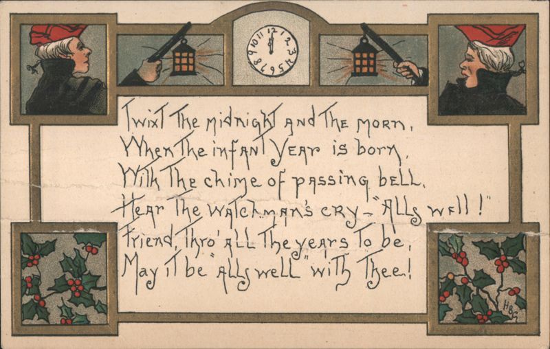 New Year's Watchman with Lantern, Clock & Holly Greeting Poem