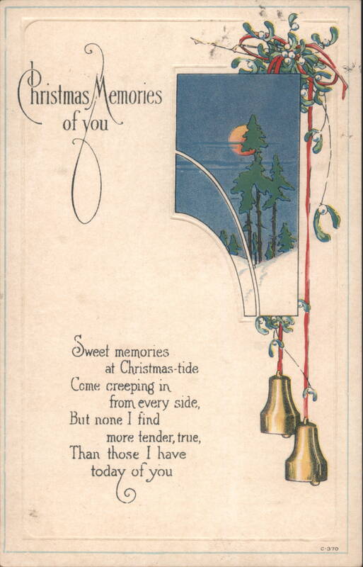 | The front of the card features an illustration with the title "Christmas Memories of you" in elegant script. Below this, a poem reads: "Sweet memories at Christmas-tide Come creeping in from every side, But none I find more tender, true, Than those I have today of you." The artwork depicts a serene winter landscape under a moonlit or sunset sky, with tall evergreen trees and snow-covered ground, framed by a decorative border. Adorning the right side are sprigs of mistletoe with red berries and a red ribbon, from which two golden bells hang. |