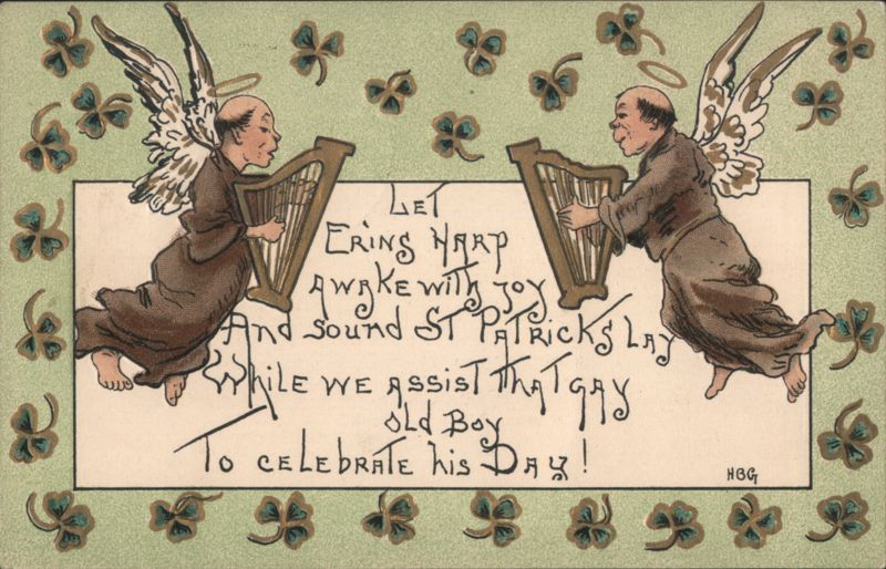 Two robed angels with halos are depicted playing golden harps, surrounded by numerous green shamrocks. The central white panel features a St. Patrick's Day greeting in ornate script, encouraging the celebration of the day with "Erin's Harp." |