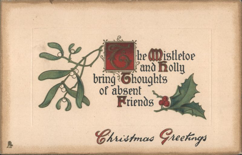 | An illustrated Christmas greeting card featuring mistletoe and holly branches. The text reads 'The Mistletoe and Holly bring Thoughts of absent Friends' and 'Christmas Greetings'. The reverse side is a Tuck's Post Card from the 'Olde Englyshe' Series No C 1782, addressed to Mrs. Fred Swanton in Millbridge, Maine, with a Canadian one-cent stamp and a 1909 postmark. |