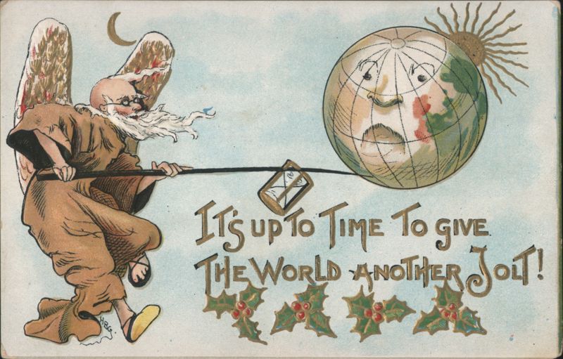 | An allegorical scene depicting Father Time, with wings and a long white beard, pushing a sad-faced globe with a long pole. The globe is shown with a sun rising behind it. Holly leaves with berries are at the bottom. The message suggests a New Year's theme of change or renewal. |