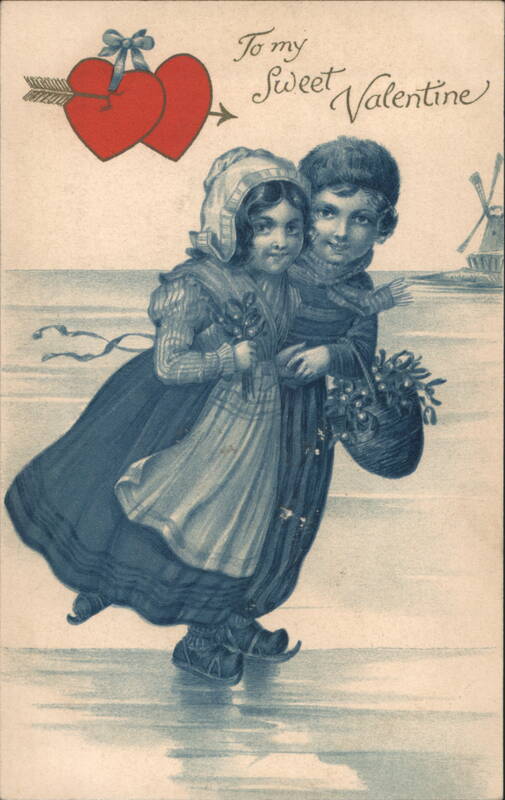 Two young children, dressed in traditional Dutch clothing, ice skate on a frozen surface. The child in front holds a bouquet of flowers, while the child behind carries a basket of flowers and embraces the first. A windmill is visible in the background. The card features two red hearts pierced by an arrow, tied with a blue bow, and the message "To my Sweet Valentine". |