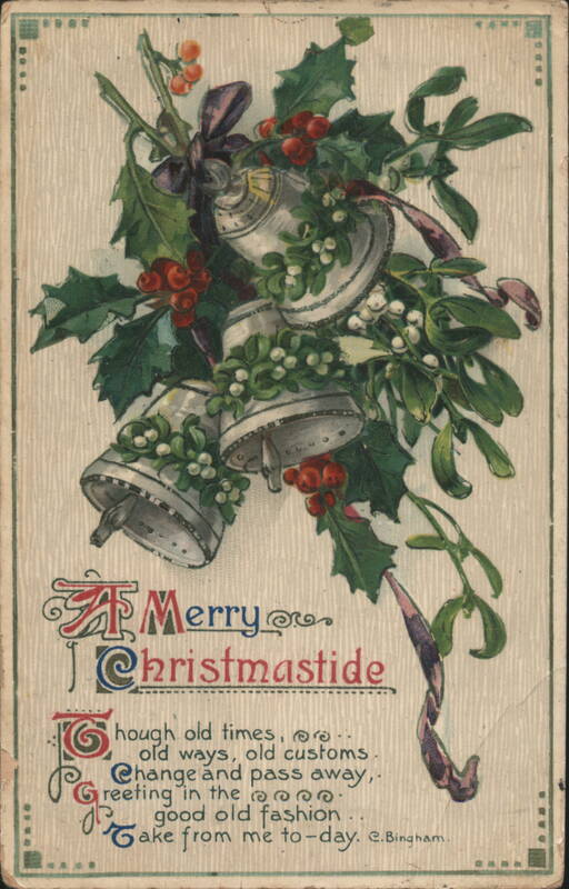 An illustration featuring three silver Christmas bells adorned with red holly berries, green holly leaves, and white mistletoe. A purple ribbon is tied around the bells. The greeting reads 'A Merry Christmastide' with a poem below: 'Though old times, old ways, old customs, Change and pass away, Greeting in the good old fashion I take from me to-day. E. Bingham.' |