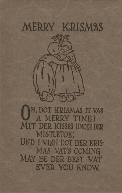 Two children, a boy and a girl, embrace under a sprig of mistletoe. Below them is a humorous Christmas greeting poem written in a phonetic dialect.