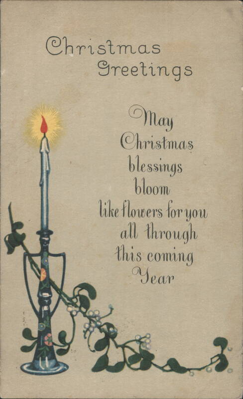 A Christmas greeting card featuring a glowing candle in a blue candelabra, adorned with green ivy and white berries. The card wishes 'Christmas blessings bloom like flowers' for the coming year.