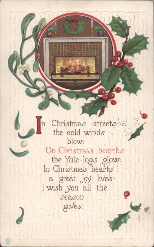 A festive Christmas greeting featuring a cozy fireplace with glowing Yule logs, surrounded by a wreath of holly with red berries and mistletoe with white berries. The card includes a poem about Christmas streets, hearths, and hearts.