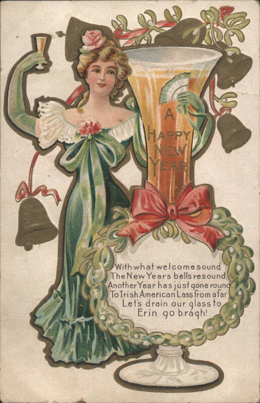 An illustrated die-cut card featuring a woman in a flowing green dress holding a champagne glass, standing beside a giant champagne flute that reads 'A HAPPY NEW YEAR.' The scene is adorned with bells, a red bow, and a wreath. A poem about New Year's and 'Erin go bragh!' is printed on the front. |