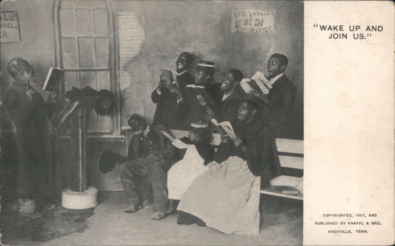 A group of African American men and women are gathered indoors, likely for a religious service or community meeting. One man stands at a podium, possibly leading, while others hold books, appearing to sing. The wall behind them features the prominent English phrase "WAKE UP AND JOIN US." and a less clear German phrase "LEBE VORRAZER AT DE DO BEAUOM COPES". |