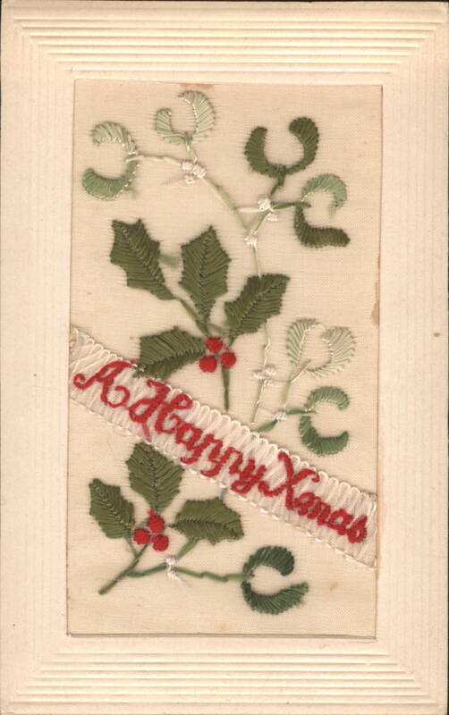 Embroidered A Happy Xmas Holly and Mistletoe Greeting
