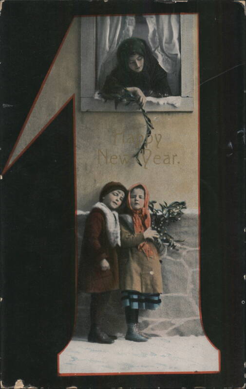 | A festive New Year's scene featuring a prominent, stylized number '1' as the central motif. Within the upper part of the '1', a woman looks out from a window, holding a leafy branch. Below her, the greeting 'Happy New Year.' is inscribed. At the base of the '1', two children in winter clothing stand in a snowy landscape, one holding a sprig of mistletoe or holly. |