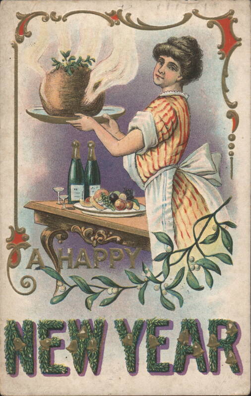 An illustrated scene featuring a woman in a striped dress and white apron, holding a tray with a steaming pudding garnished with holly. She stands beside a table laden with champagne bottles, a glass, and a fruit platter. The design is framed with decorative elements including mistletoe and bells, with the greeting "A HAPPY NEW YEAR" at the bottom. The back has a handwritten message and is postmarked December 31, 1923, addressed to Hershey, PA. |