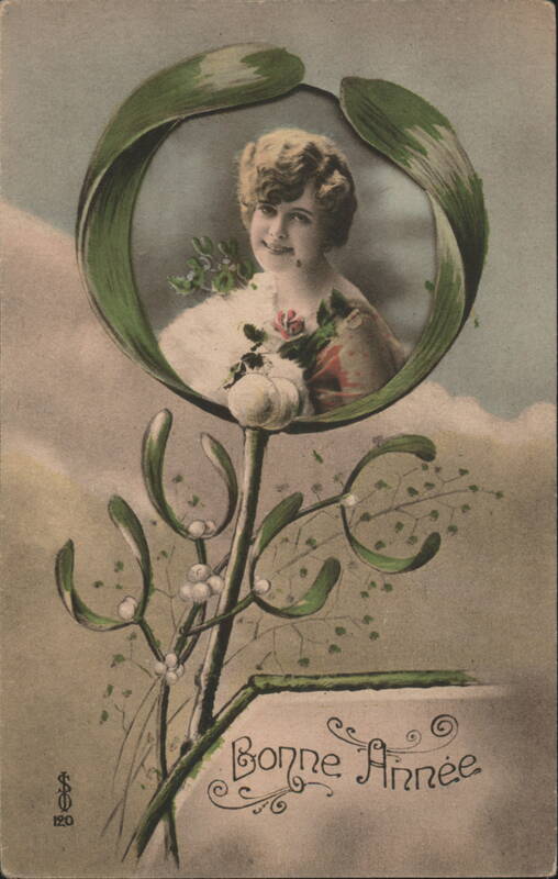 A smiling woman with blonde hair, wearing a white fur stole and a floral dress, is framed by a large mistletoe branch. The card features the French greeting 'Bonne Année' for the New Year.