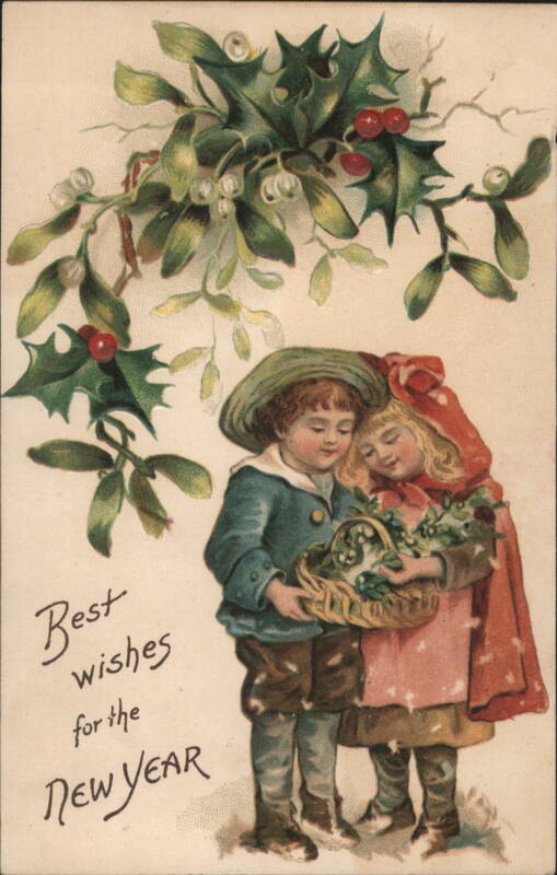| An illustration of a young boy in a green hat and blue jacket, and a young girl in a red hooded cloak, standing together and holding a small woven basket filled with mistletoe. Above them, branches of holly with red berries and mistletoe with white berries hang down. The card includes a "Best wishes for the New YEAR" greeting. |