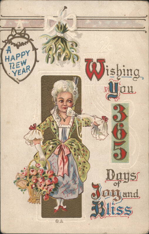 An illustrated New Year's greeting card featuring an elegant woman in a Rococo-style gown, holding a fan and a basket of red roses. Above her, mistletoe hangs from a bow, and text reads 'A Happy New Year'. The main greeting wishes '365 Days of Joy and Bliss'. |