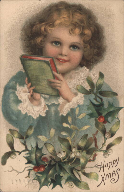 A young girl with curly blonde hair and blue eyes, wearing a light blue dress with white lace, holds an open green book. Below her is a festive arrangement of holly with red berries and mistletoe with white berries. The greeting "Happy XMAS" is written at the bottom right. The reverse side shows a message from Aunt Anna to Master Gordon Murray, dated December 15, 1909, wishing him a Merry Christmas and lots of toys from Santa Claus. |