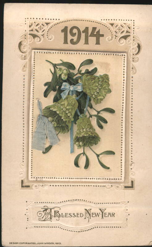 | The front features a decorative border with the year 1914 at the top. The central image shows a cluster of green, bell-shaped plants resembling mistletoe, adorned with light blue ribbons. Below the main image, the greeting 'A Blessed New Year' is inscribed in an ornate frame. |