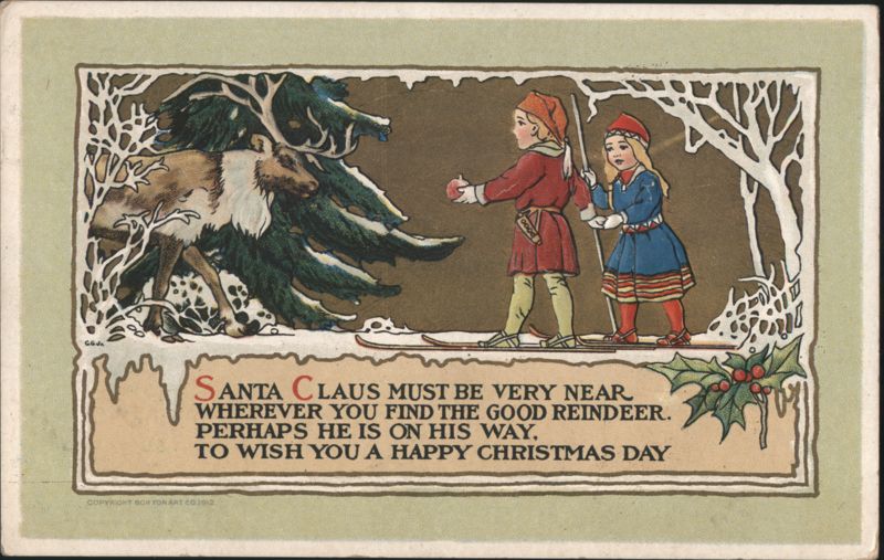 A boy and a girl, dressed in winter attire, are standing on skis in a snowy forest. The boy holds an apple, and a large reindeer stands to their left, near snow-covered pine trees. Bare, snow-dusted trees frame the right side of the scene. A Christmas greeting is printed below the illustration: 'SANTA CLAUS MUST BE VERY NEAR WHEREVER YOU FIND THE GOOD REINDEER. PERHAPS HE IS ON HIS WAY, TO WISH YOU A HAPPY CHRISTMAS DAY'. |