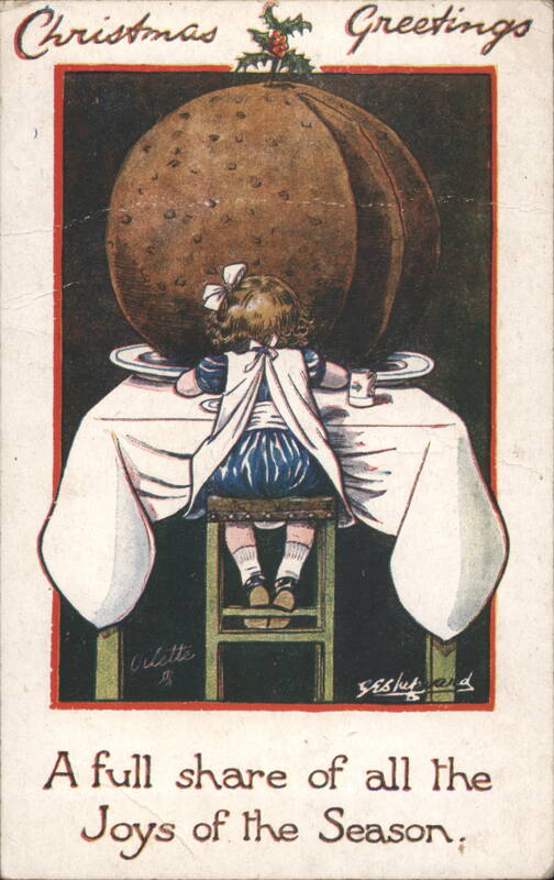 Christmas Greetings Little Girl Giant Plum Pudding Holiday Season