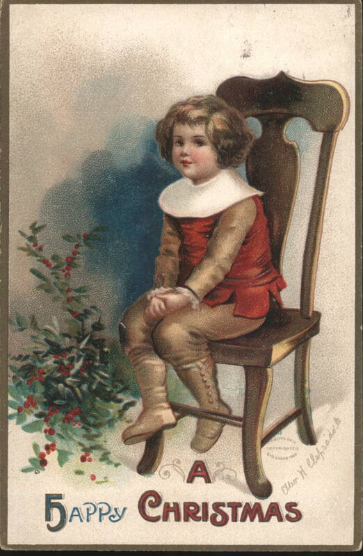 A color illustration of a young child, possibly a boy, with curly brown hair, seated on a dark wooden chair. The child wears a white collar, a red tunic-like top, and light brown trousers with matching boots. To the left, a sprig of holly with red berries is visible. The foreground features the greeting "A Happy Christmas." |