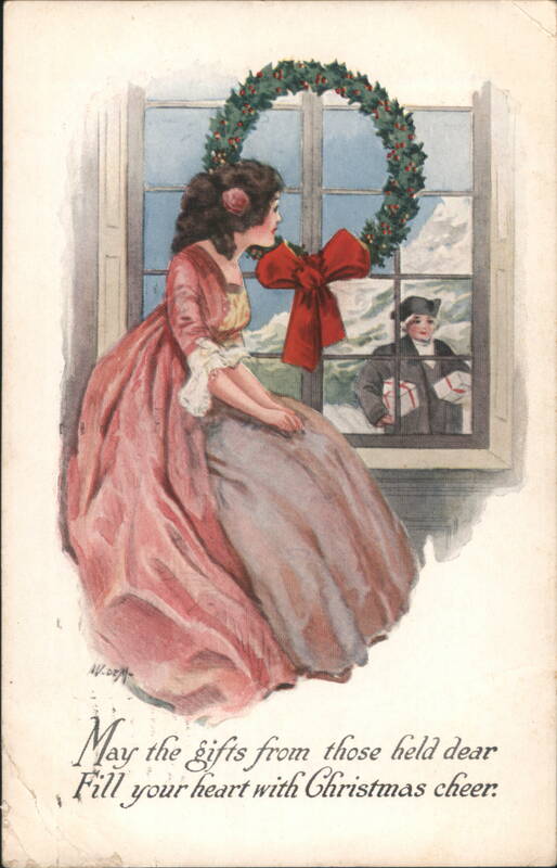 A young woman in a flowing pink and grey dress gazes out a window adorned with a festive green Christmas wreath and a large red bow. Outside, a boy in a winter hat holds two wrapped presents, looking towards the window. Snow covers the ground outside. The card features a holiday greeting: "May the gifts from those held dear Fill your heart with Christmas cheer."