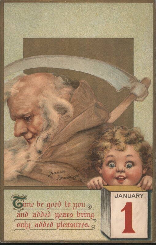 | An elderly man with a long white beard and a scythe, representing Father Time, looks down at a cheerful baby, symbolizing the New Year. The baby peeks over a calendar block displaying 'JANUARY 1'. The card includes a New Year's greeting about good time and added pleasures. |