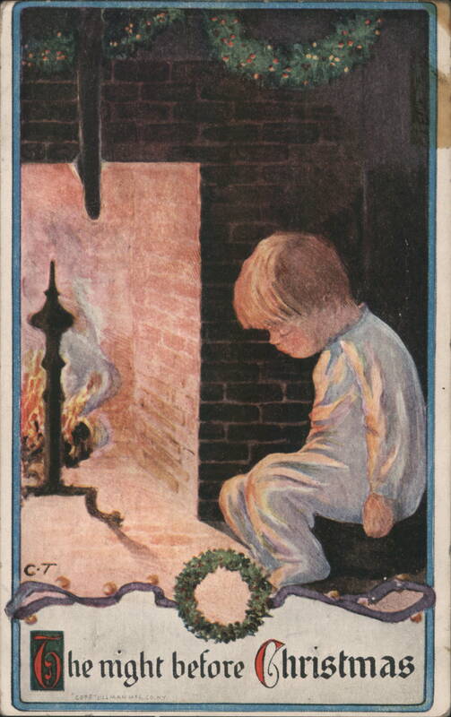 A young child in pajamas sits by a roaring fireplace, gazing into the flames. A festive wreath decorates the bottom border, illustrating the classic poem 'The Night Before Christmas'.
