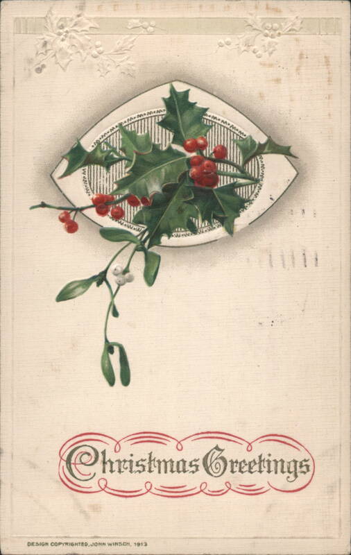 A festive design featuring a central arrangement of holly leaves and red berries, set within a decorative border. Below, a sprig of mistletoe with white berries hangs. The phrase "Christmas Greetings" is written in ornate red script at the bottom, all against a textured, light background. |