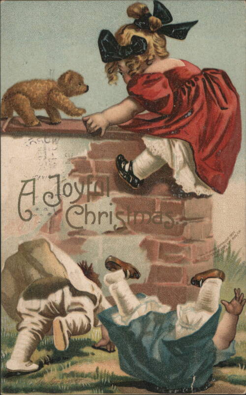 A young girl in a red dress and a large black bow sits atop a brick wall, reaching out to a teddy bear. Below her, two children are depicted tumbling on the ground. The card features the greeting 'A Joyful Christmas'.