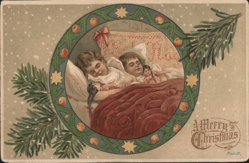 Two young children, a boy and a girl, are depicted sleeping peacefully in a bed, framed by a festive circular wreath of pine branches and red apples. A small doll rests beside the girl, adding to the serene Christmas scene.