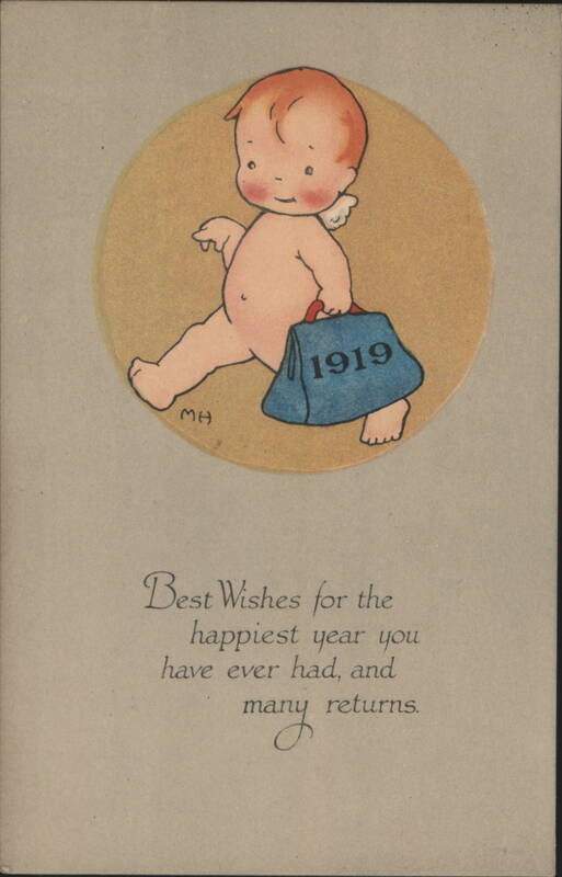 | Illustration of a cute, rosy-cheeked baby cherub with small wings, walking and carrying a blue bag with '1919' printed on it. The baby is set against a golden circular background. Below the illustration, the greeting reads, 'Best Wishes for the happiest year you have ever had, and many returns.' |