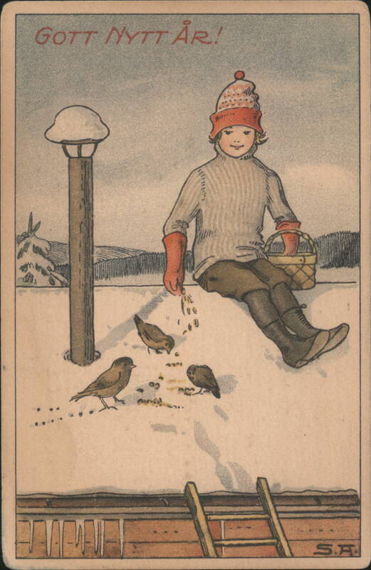 An illustrated scene of a child in a winter hat and gloves, sitting in deep snow and scattering seeds for small birds. A snow-covered lamppost stands nearby, with a fence and ladder in the foreground. A snowy landscape with trees is visible in the background.