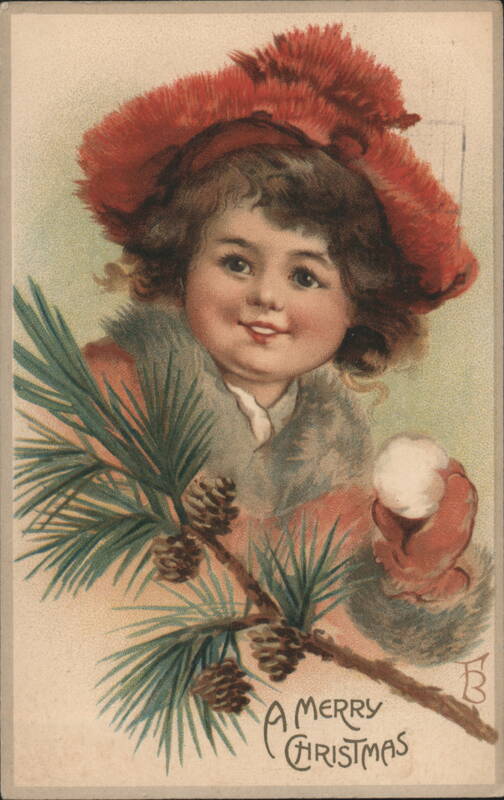 A charming illustration of a young child, likely a girl, with a round face and rosy cheeks, wearing a vibrant red furry hat and a matching fur-trimmed coat. She holds a pine branch adorned with several pinecones. The overall theme is a festive Christmas greeting. |