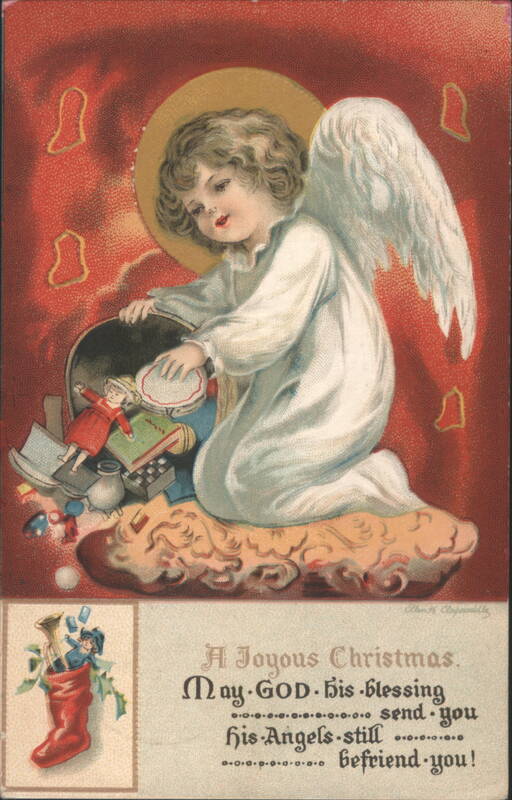 A cherubic angel with a golden halo and white wings kneels on a fluffy cloud, looking into a basket overflowing with Christmas toys including a doll, drum, horn, and building blocks. The background is a rich red adorned with golden bells. The card features a Christmas greeting: 'A Joyous Christmas. May GOD. His blessing send you his Angels still befriend you! |